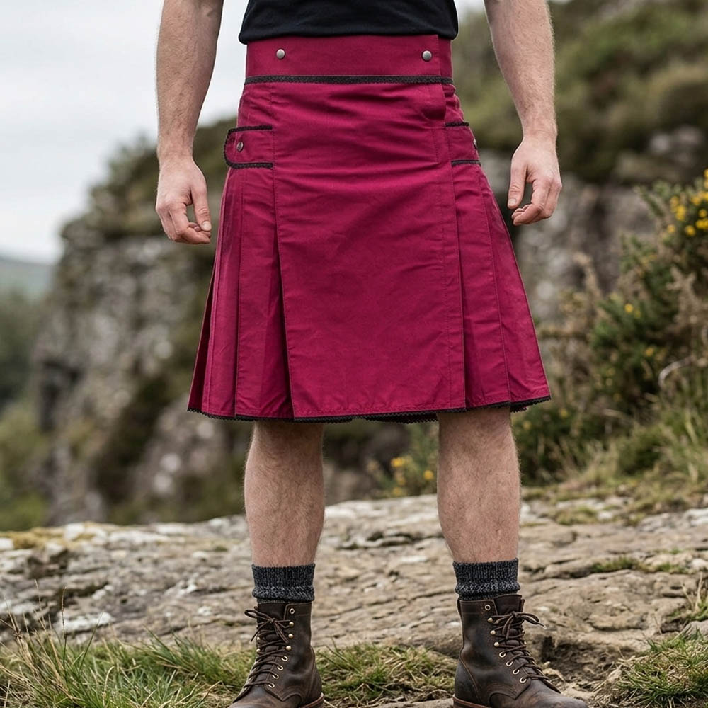 Burgundy is one of the most versatile colorways in men’s kiltwear. It pairs equally well with black boots and a simple tee for festival wear, or with a dark shirt and sporran for semi-formal events. It commands attention without competing with your accessories — which is exactly what a utility kilt should do.